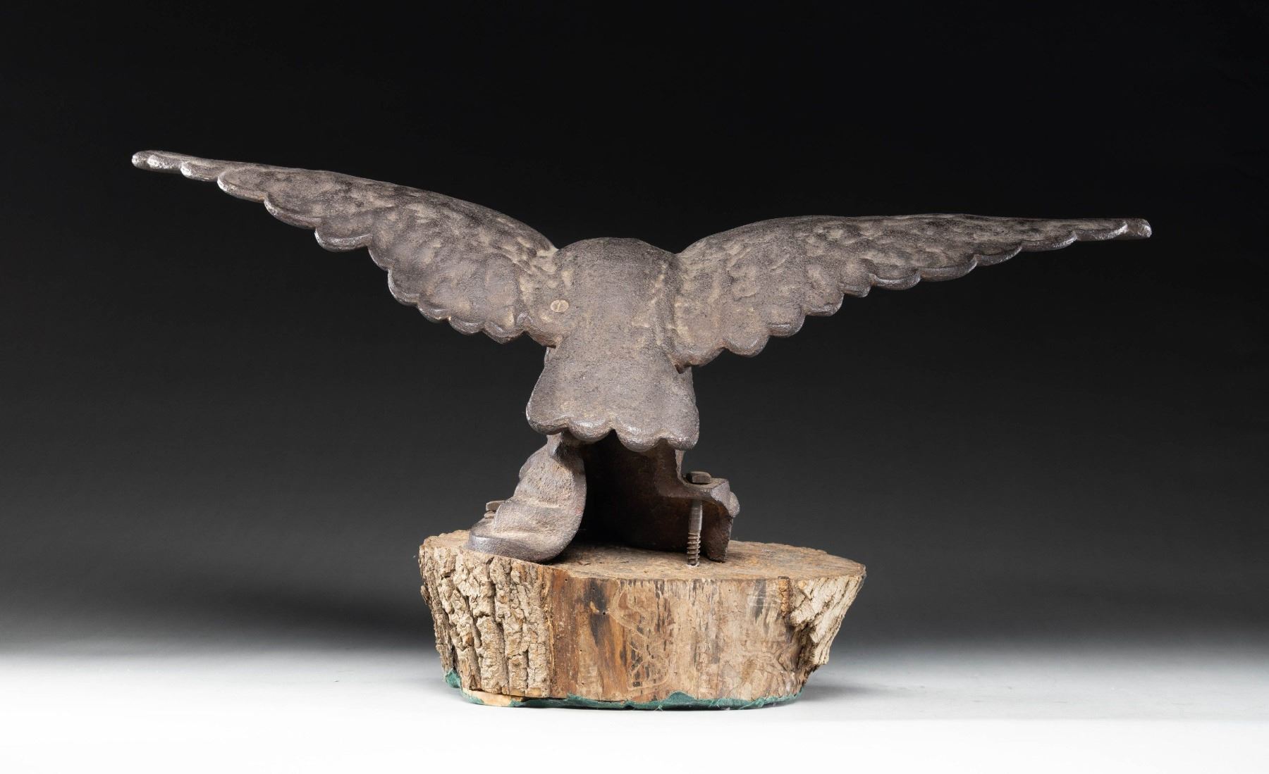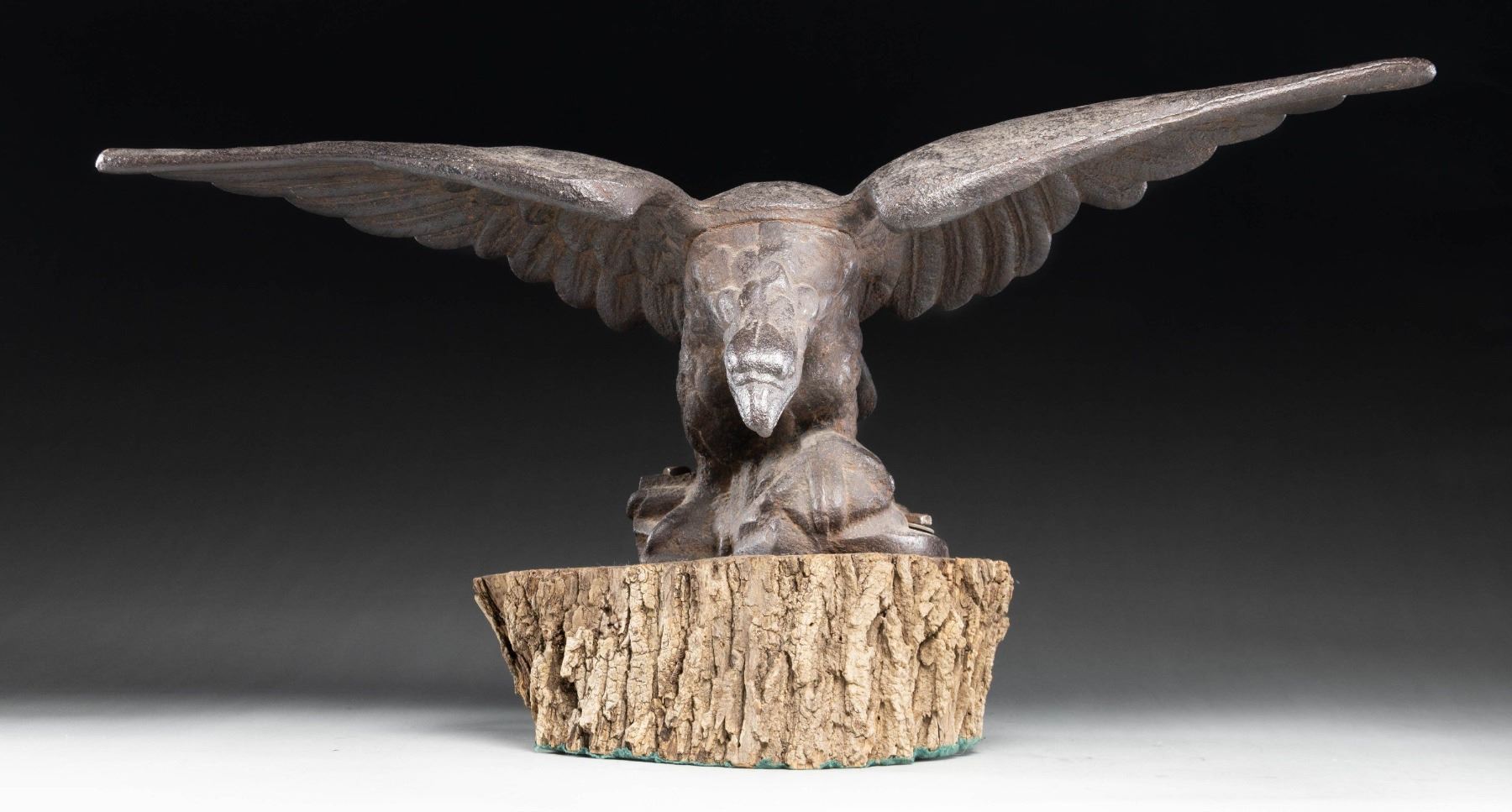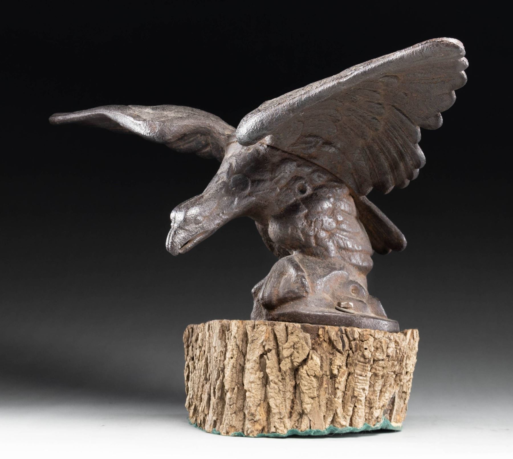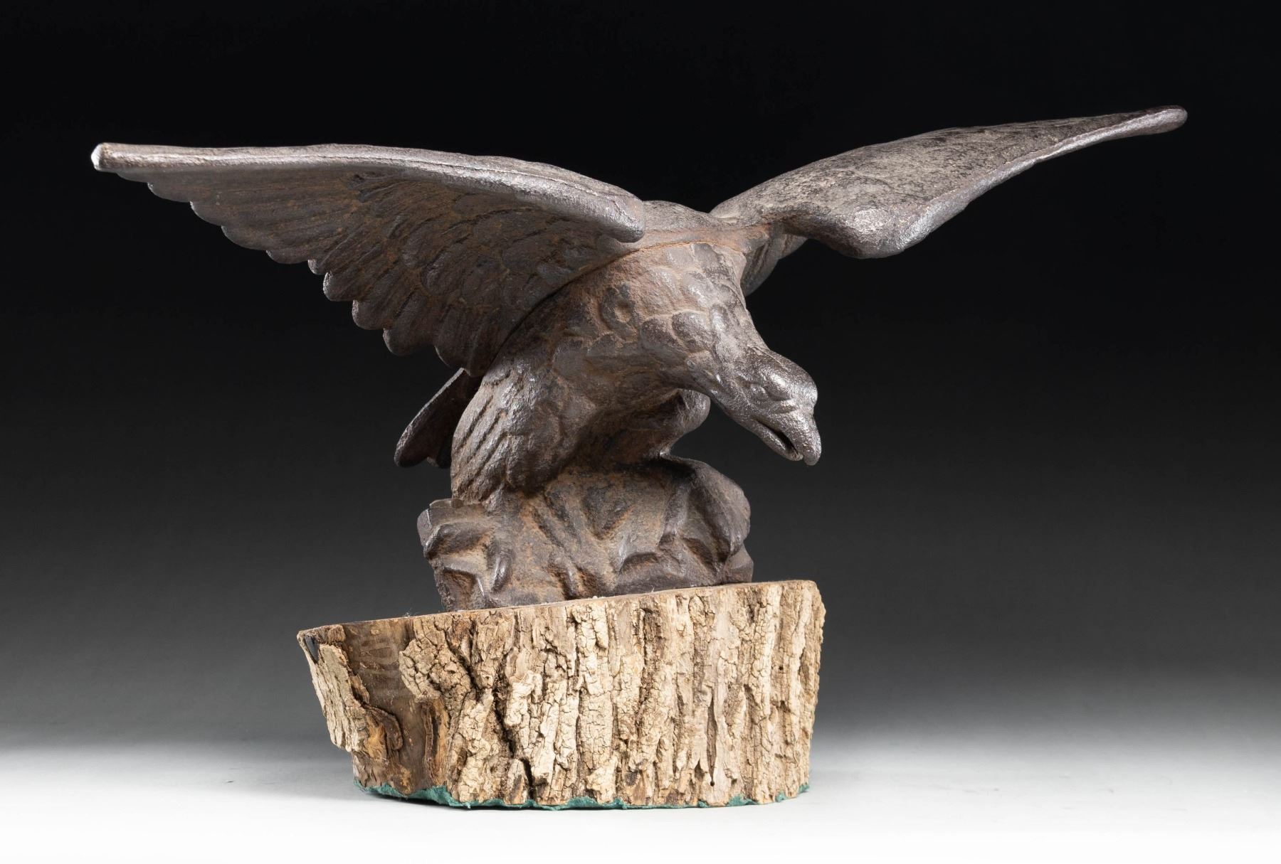 Cast iron eagle sculpture circa 1850-1870 reportedly removed from a Philadelphia foundry. The eagle maybe a product of the Wood & Perot foundry which operated from 1858 until 1866. This foundry also specialized in making animals & furniture. The eagle measures 31" in wingspan & 9" in height. It is mounted on a wooden pedestal. Three screw holes on top with one vacant hole. UNATTACHED ACCESSORIES: an old sales sheet detailing information about this eagle. CONDITION: metal has a gray patina appearance with age related wear such as old oxidation & gray staining. PROVENANCE: Estate Collection of Nicholas Apergis. (02-24808/MJC). NON-GUN. $400-600.