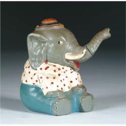 CAST IRON ELEPHANT STILL BANK.  Animated costumed elephant with hat.  SIZE:  Approximately 4” h.  CONDITION:  Excellent.  Has wonderful paint.  1-4673 (150-300)