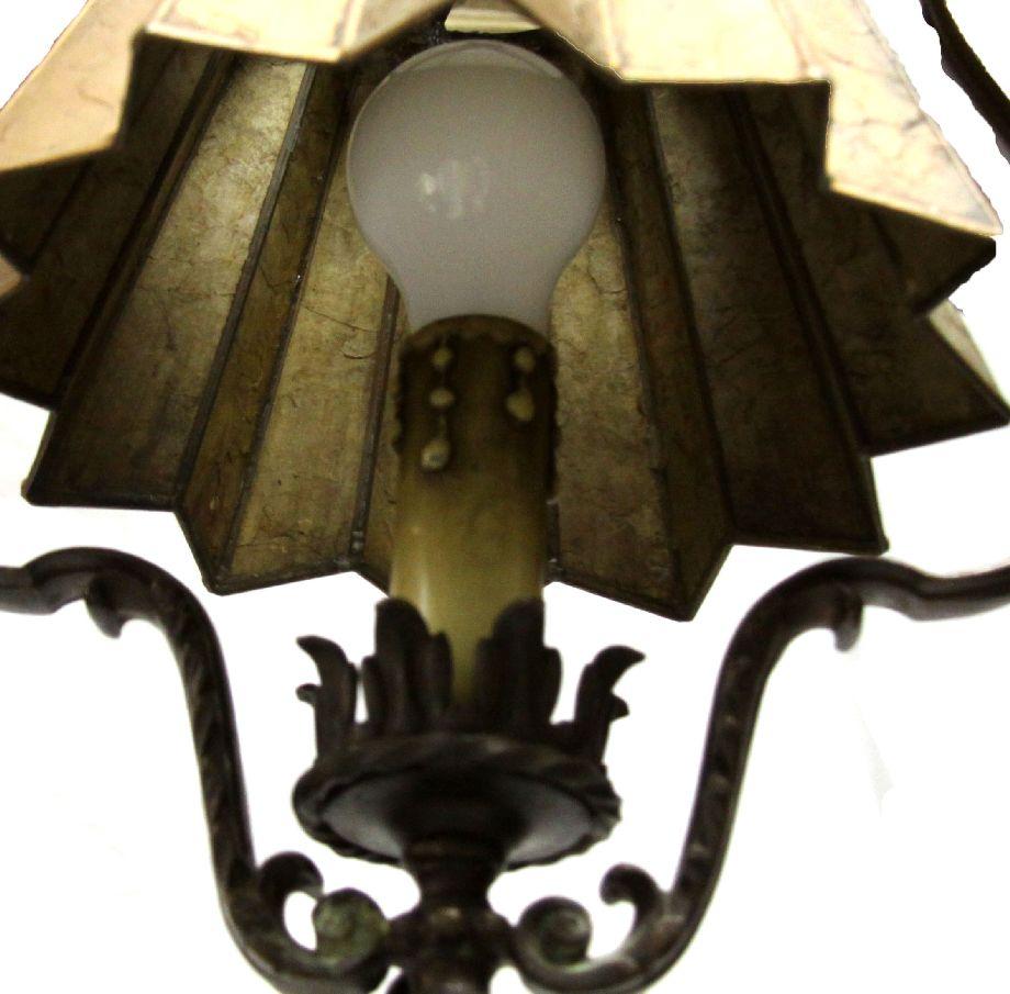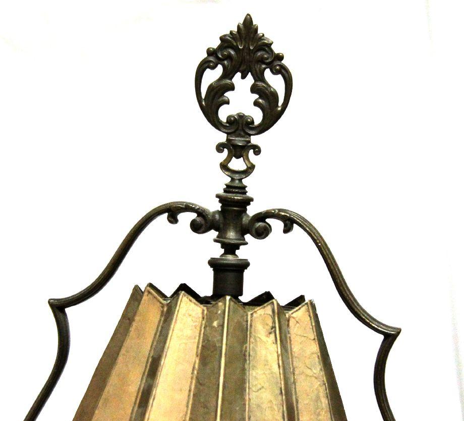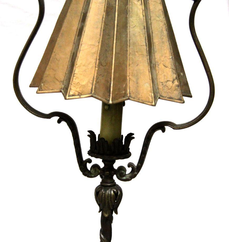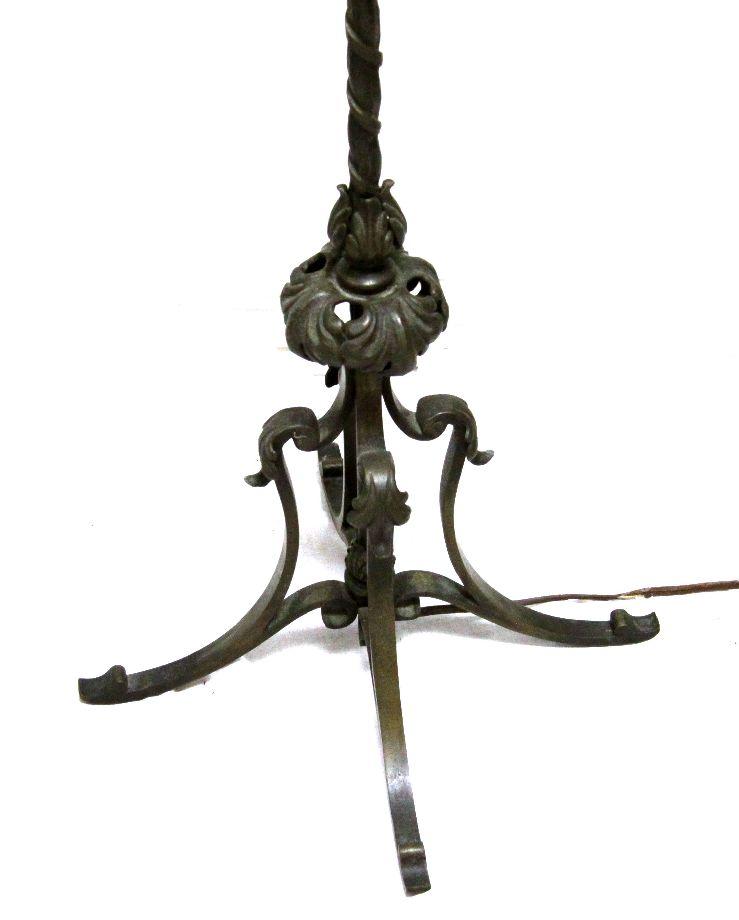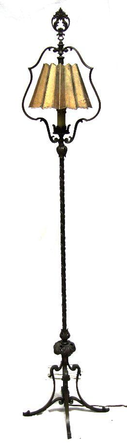 64 Inches tall. Cast iron with painted shade. Harp top with 4 feet. Very heavy. Overall good condition and needing rewiring.