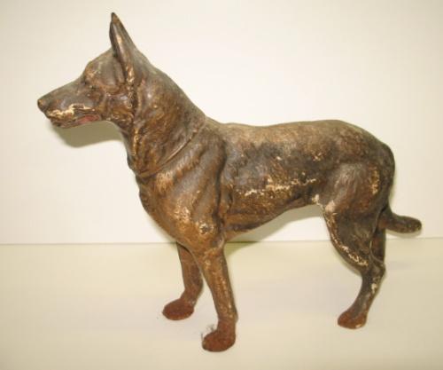 CAST IRON GERMAN SHEPHERD DOOR STOP. Shows rusting along back and head of dog and shows loss to paint throughout. 10" H