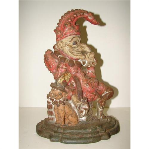 CAST IRON JESTER DOOR STOP. Depicts a seated jester with a dog. Shows loss to paint. 12” H