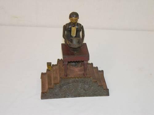 CAST IRON MAGICIAN MECHANICAL BANK BY J & E STEVENS PAT. 1901 - PAINT LOSSES & WEAR;