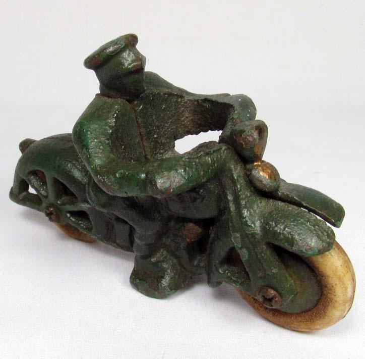 CAST IRON MOTORCYCLE TOY - Wheels are marked but too hard to read.