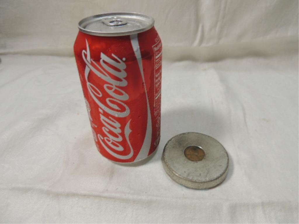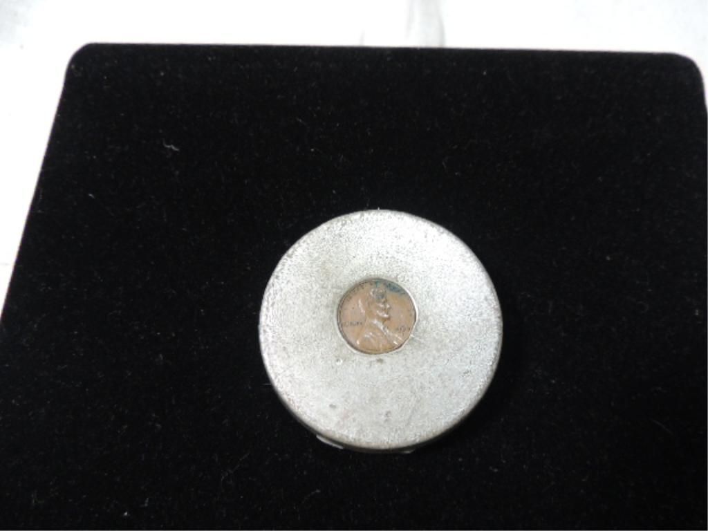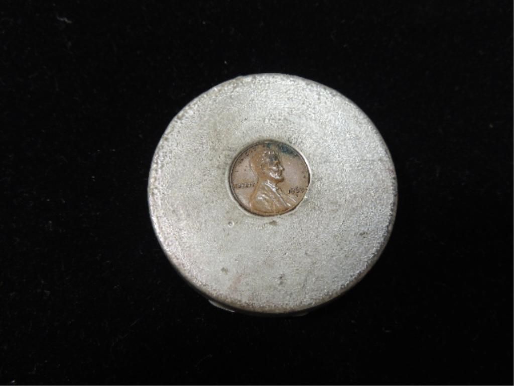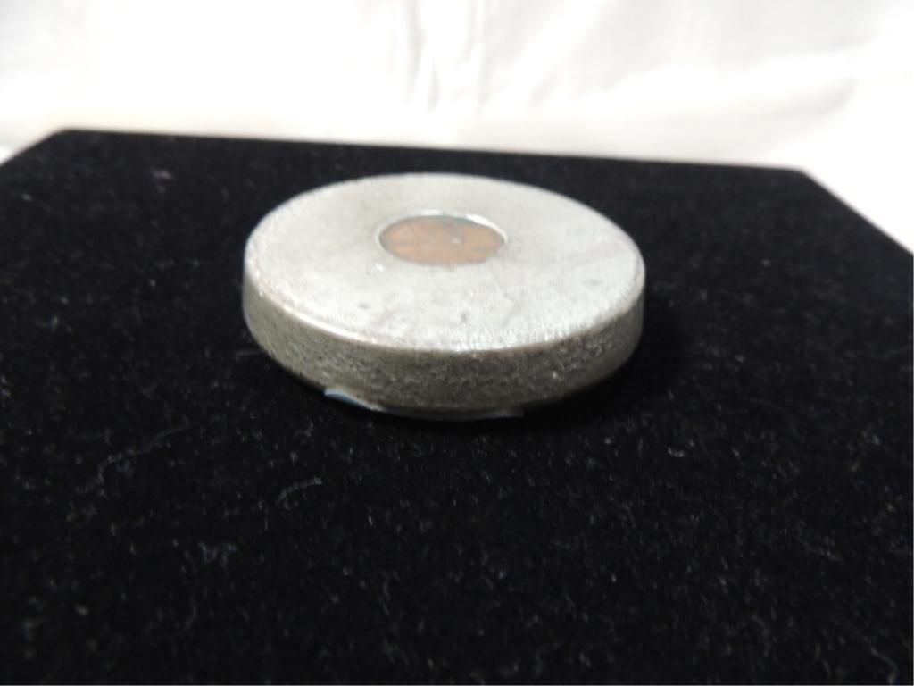 CAST IRON ROUND PAPERWEIGHT WITH 1963 PENNY INSERT. AS SHOWN. SEE PHOTO FOR MORE DETAILS.