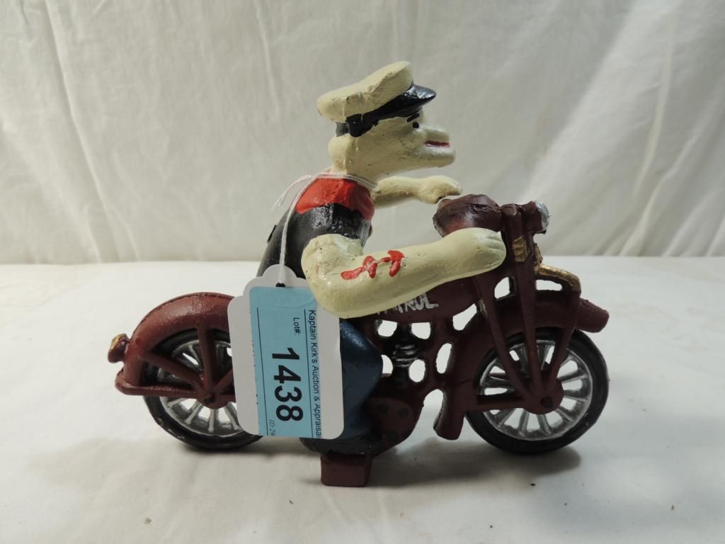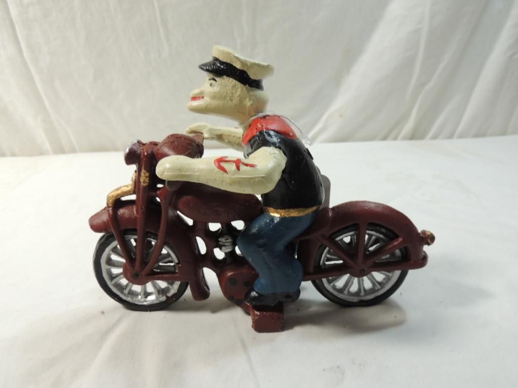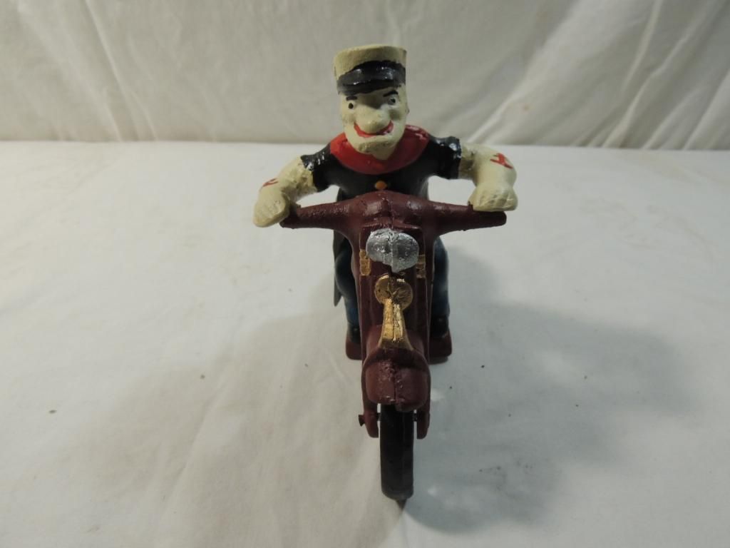 VINTAGE CAST IRON POPEYE MOTORCYCLE TOY. AS SHOWN SEE PHOTO FOR MORE DETAILS.
