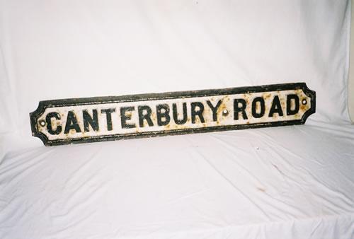 CAST IRON ROAD SIGN " CANTERBURY " BLACK AND WHITE PAINTED, SOME RUST AND WEAR ( 50L X 8D X 3 1/4T)