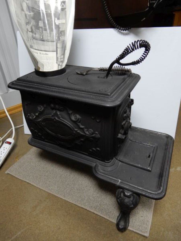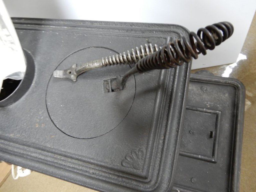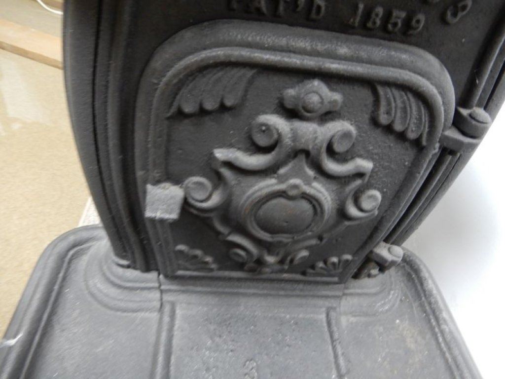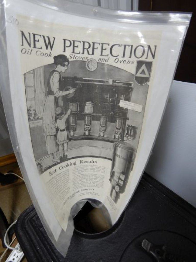 CAST IRON SETTLERS STOVE PAT 1859 - WITH ACCESSORIES - 24 1/2" X 19" X 18 1/2" - NEW PERFECTIONS STOVE & OVENS ADVERTISMENT LOCATION: LOWER LEFT
