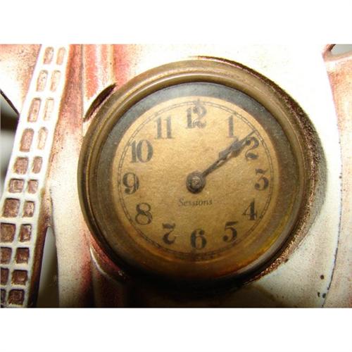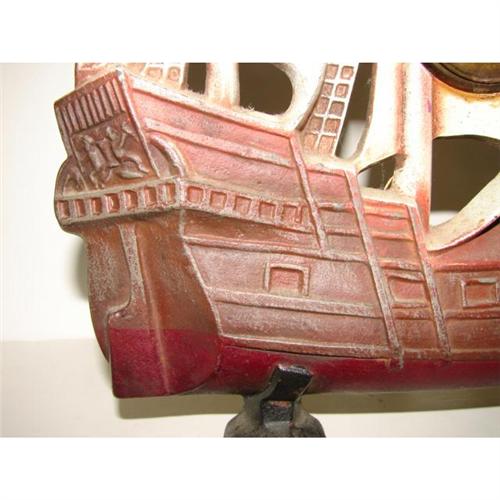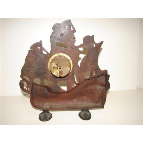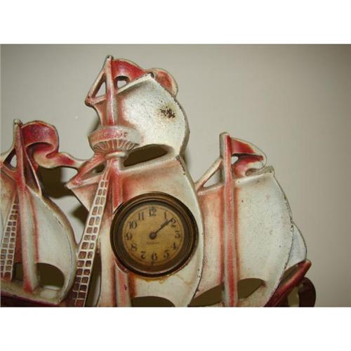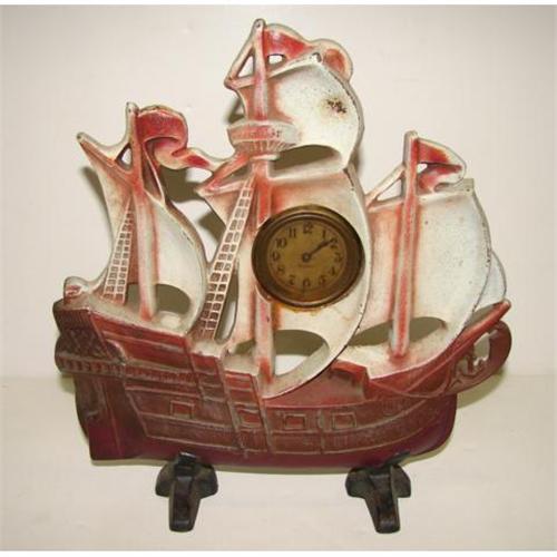 CAST IRON SHIP CLOCK. In the form of a three mast warship. Has Sessions circular clock insert. Shows minor loss to paint. 11.5” H