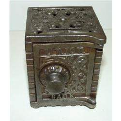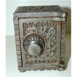 CAST IRON STILL BANK. Union Bank safe. Marked on door “Union Bank”. Marked on bottom “Kenton Brand”. Loss to paint. 3.5”