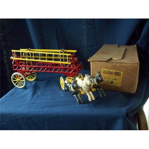 This is a horse drawn hook and ladder fire rig made of cast iron. The original box indicates No. 334. There is a 3 horse hitch pulling the fire apparatus. It is marked on the metal Made in USA.