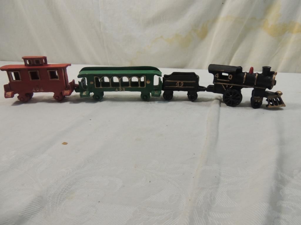 CAST IRON TOY TRAIN, VINTAGE CAST IRON TOY TRAIN, COLLECTIBLE TRAIN, CAST IRON, AS SHOWN SEE PHOTO FOR MORE DETAILS.
