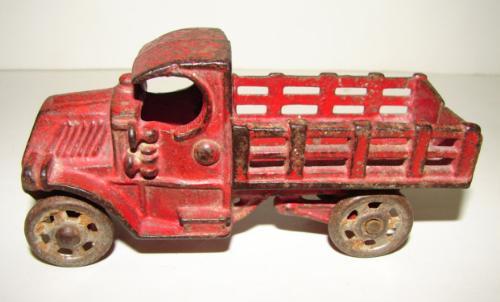 VINTAGE CAST IRON TOY STAKE BODY TRUCK. Metalware wheels. Shows some loss to red paint. 4.75” L