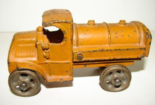 VINTAGE CAST IRON TANKER TRUCK. Metalware wheels. Marked on interior “1559”. Shows some loss to orange paint. 4.25” L