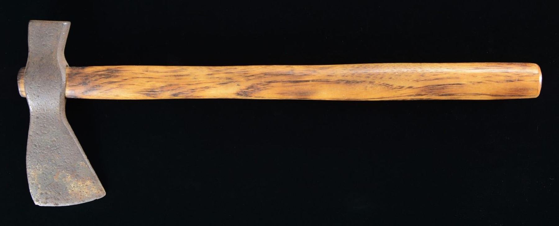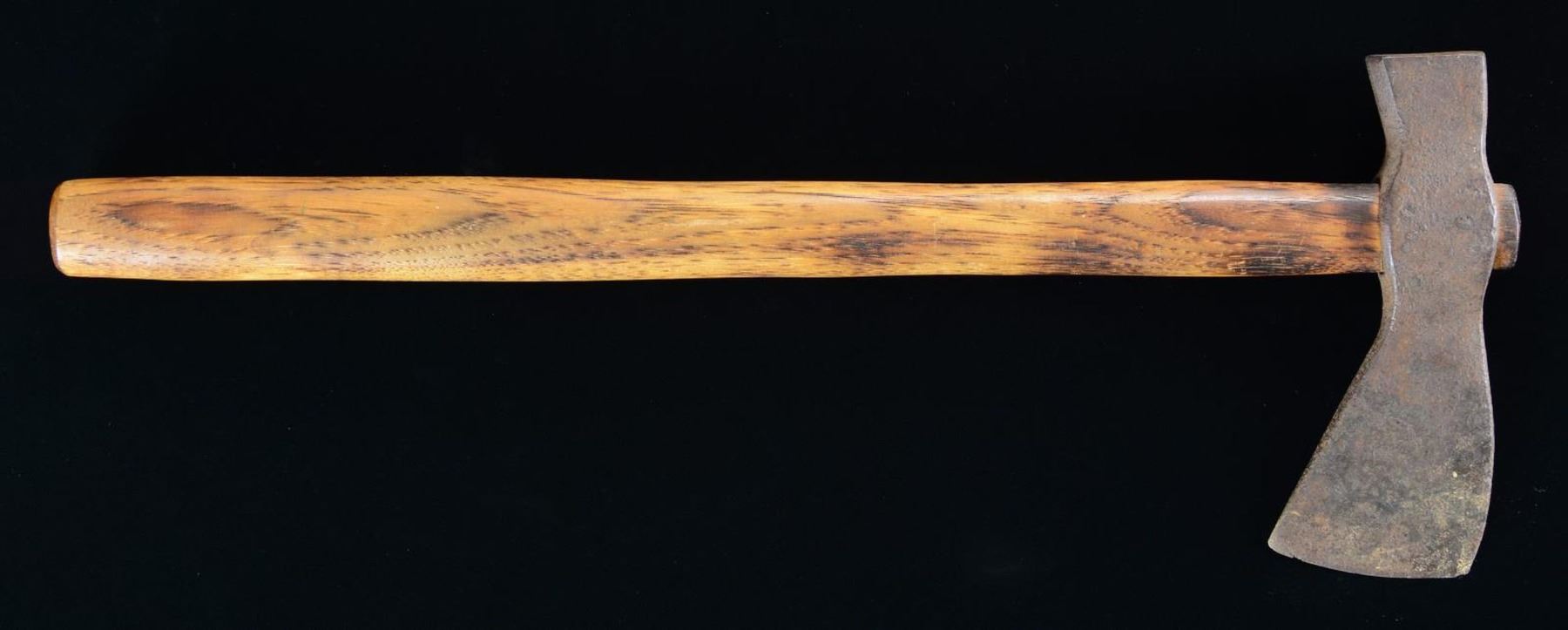 6" head, 2.25" cutting edge, 16" haft. CONDITION: new haft restored to old head with heavy iron patina & pitting. PROVENANCE: Lifelong Collection of author Milton Von Damm. (02-22245/JS). $200-300.