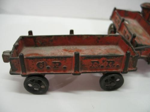 EARLY CAST IRON TRAIN PULL TOY. Features early locomotive with tender and two cars. Cars are marked “C.P.R.R.” and tender is marked “187”. One car is missing a rear wheel. All show loss to original paint. 25.5” L