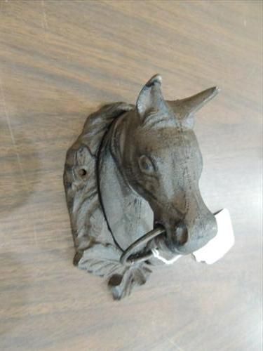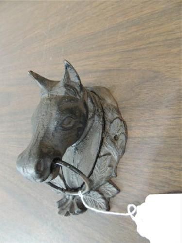 CAST IRON WALL MOUNT HORSE HEAD DECORATIVE TIE OFF.  AS SHOWN.  VIEW PICTURE FOR DETAIL.