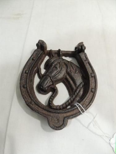 CAST IRON WESTERN STYLE DOOR KNOCKER: HORSE HEAD & HORSE SHOES. AS SHOWN. VIEW PICTURE FOR DETAIL.