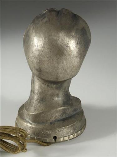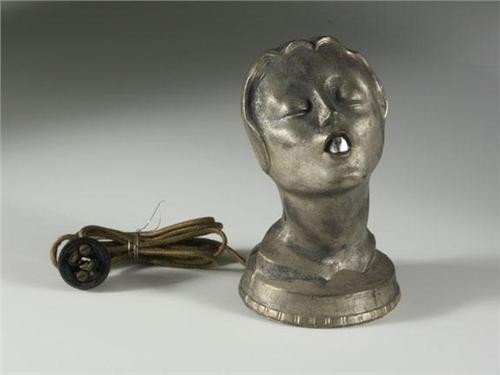 TOBACCIANA: A cast metal Art Deco electric cigarette lighter, a seductively posed silver tone female bust with an open mouth. Her mouth contains a filament which heats up when plugged in to light a cigarette, 7 3/4'' x 3 1/2'', original wiring, electrically untested, circa 1930's.