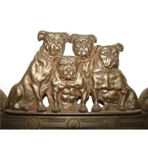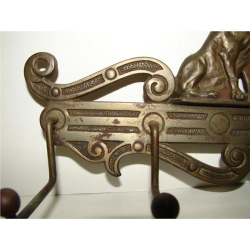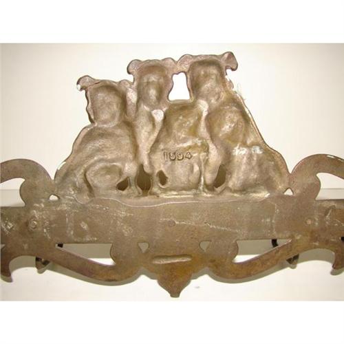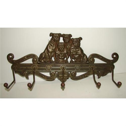CAST METAL WALL RACK. Decorated with a group of four bulldogs. Consists of five metal hooks. 12.5” L