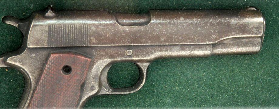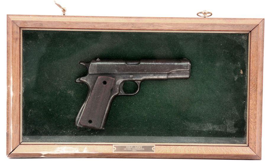 A framed shadowbox display of a cast model of a Colt 1911 pistol. good condition, with some losses to wood finish.