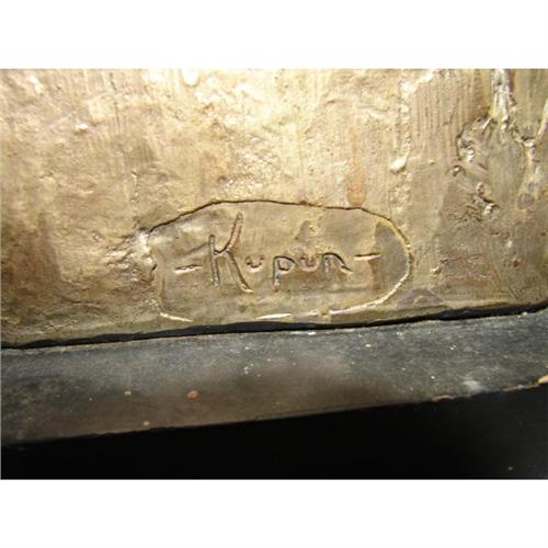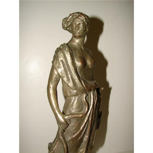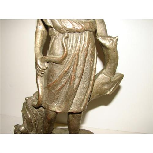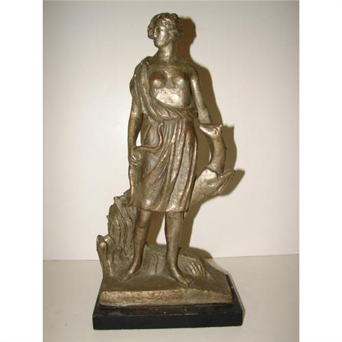 CAST RESIN STATUE OF CLASSICAL FEMALE. Depicts a toga wearing female with a dog and holding an archer’s bow in a tarnished silver finish. Signed on reverse at bottom “Kupun”. On wooden base. 16” H