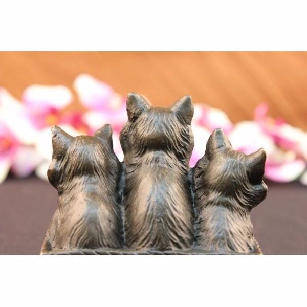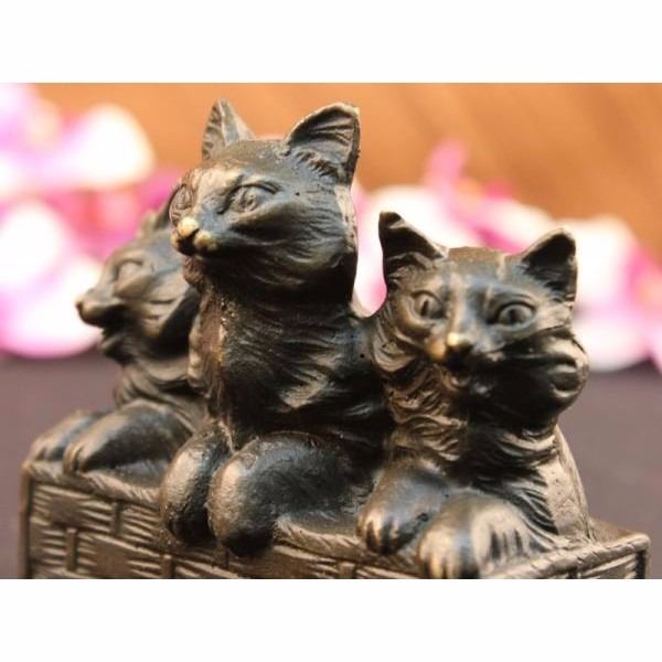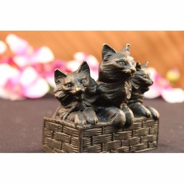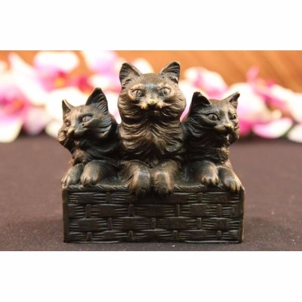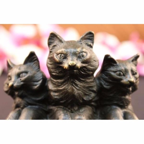 Reminiscent of the art deco period, this unique artistic rendering of a three cats sitting in a classic pose is truly a special way to memorialize your pet. Hand crafted in heavy-duty high quality bronze with an elegant antique brown finish. Our decorative Sculpture is designed with careful attention to detail and beautiful coloration This is an artistic way to memorial your companion animal Condition: This sculpture is in a very good condition. Bronze Dimensions with Marble Base:Height 4" x Width 4 1/2" Marble Dimensions: 4 1/2" X 2 1/2". Height without base: 3 1/2" Weight : 2 LBS Inventory : 1913S10991