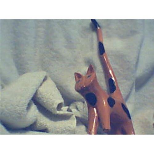 THIS IS A CAT CARVED FROM WOOD AND PAINTED. IT IS PAINTED 'FUN'MEANING WITH THE ORANGE COLORED PAINT WITH THE BLACK SPOTS. UNIQUE TO THE PIECE IS THE VERY LONG TAIL. THIS IS A MUST HAVE FOR THE CAT LOVER OR JUST ONE WHO LOVES OLD WOODEN CARVINGS. IT IS JUST AN ABSOLUTELY FUN PIECE TO LOOK AT.