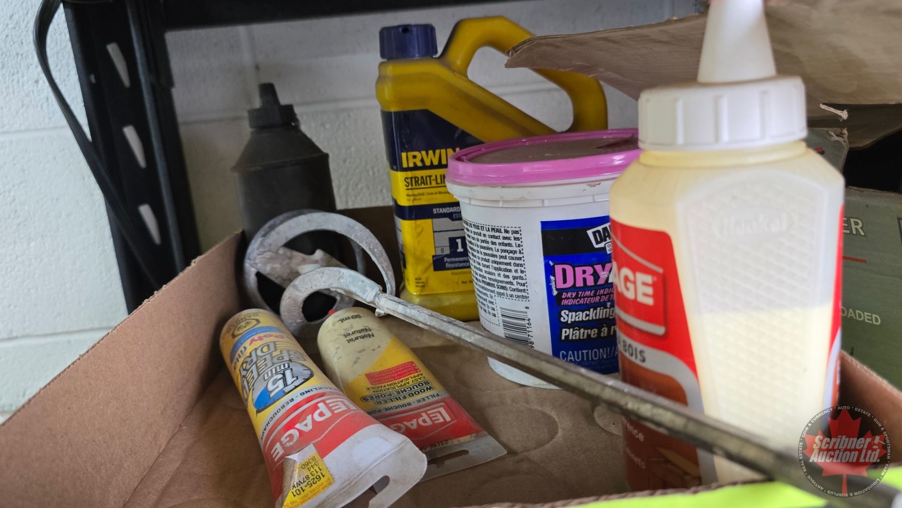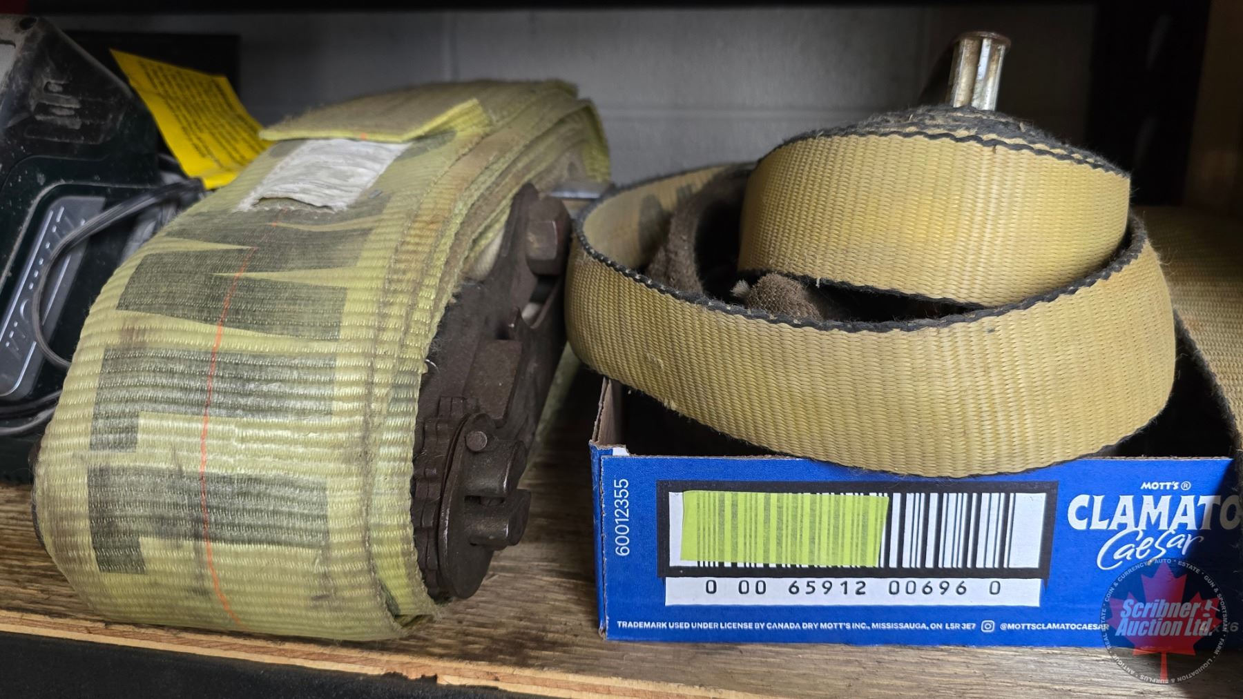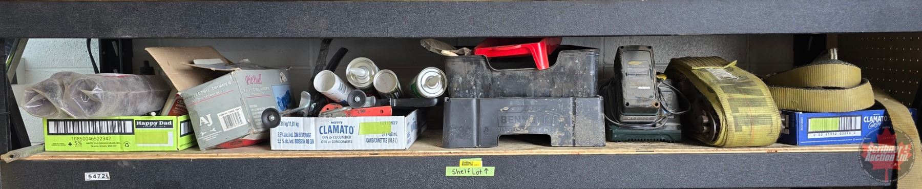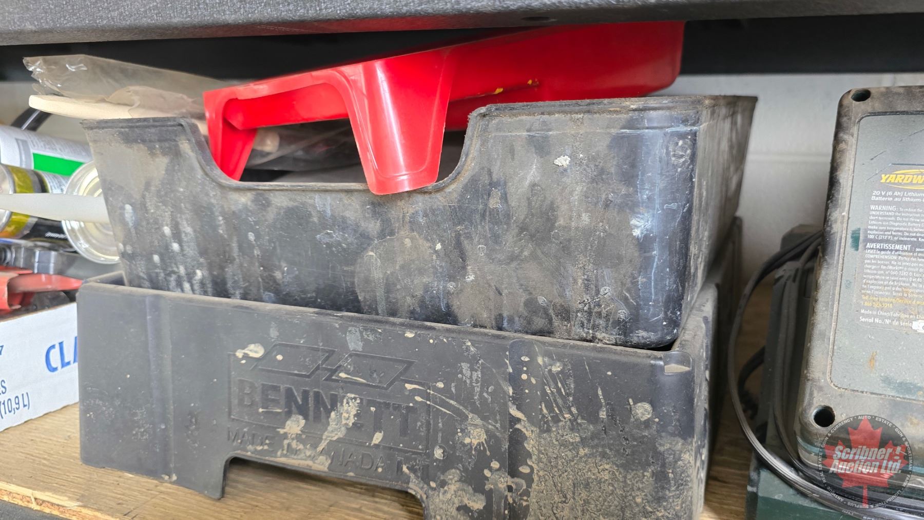 Grouping: Ratchet Straps; Yardworks Battery; Paint Troughs; Silicone Gun & Silicone; Electric Charger; Trimmer; etc