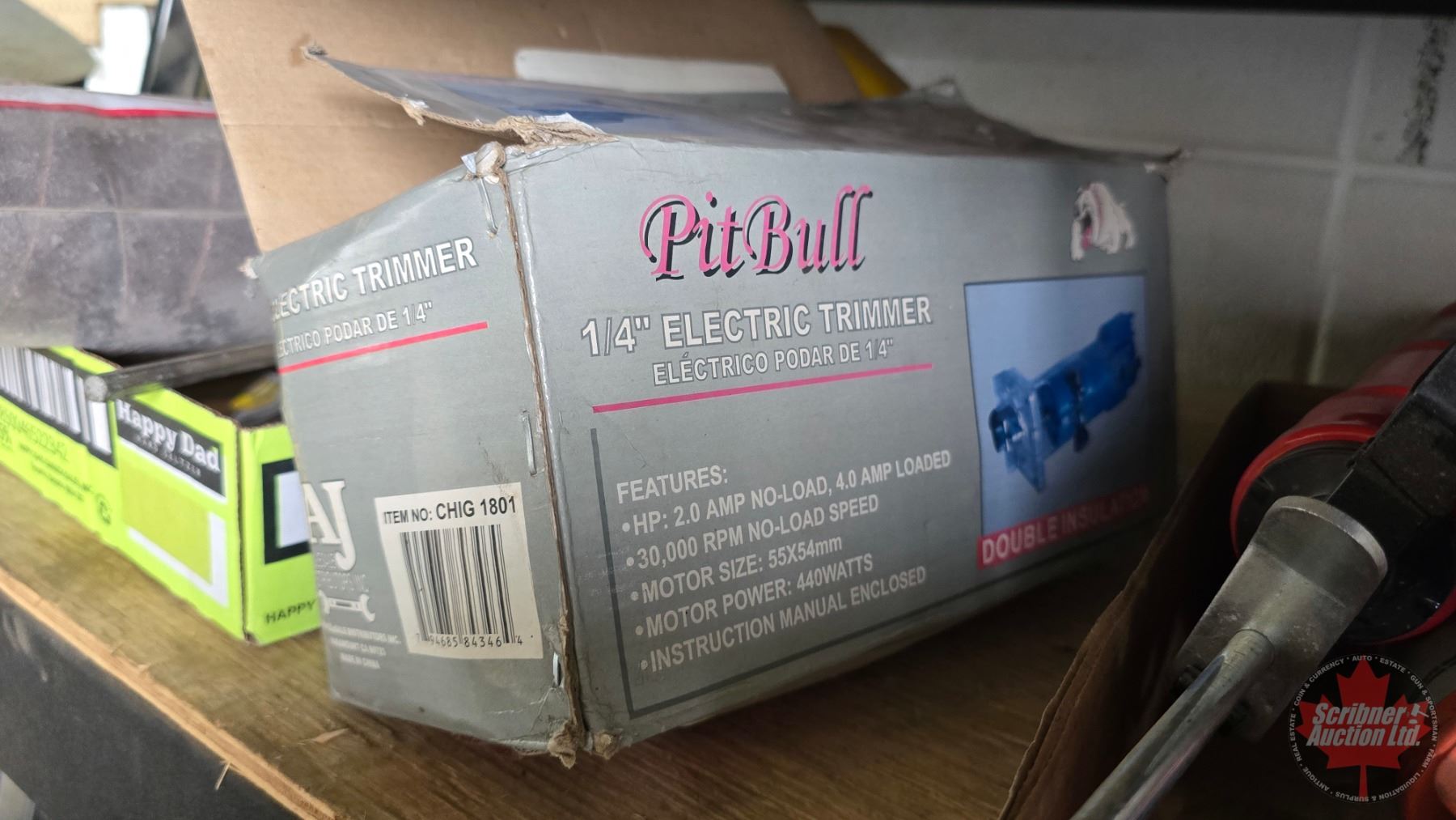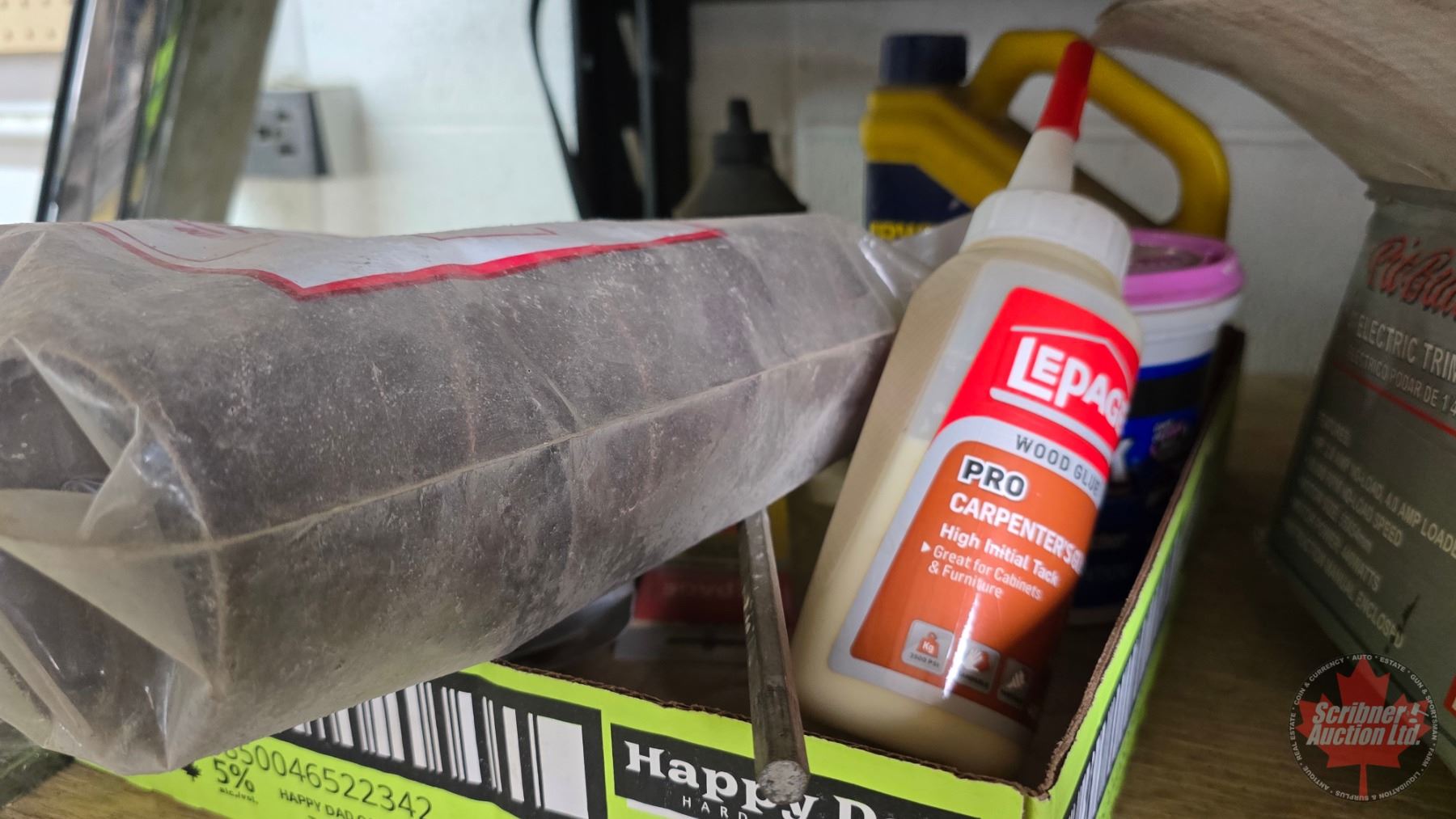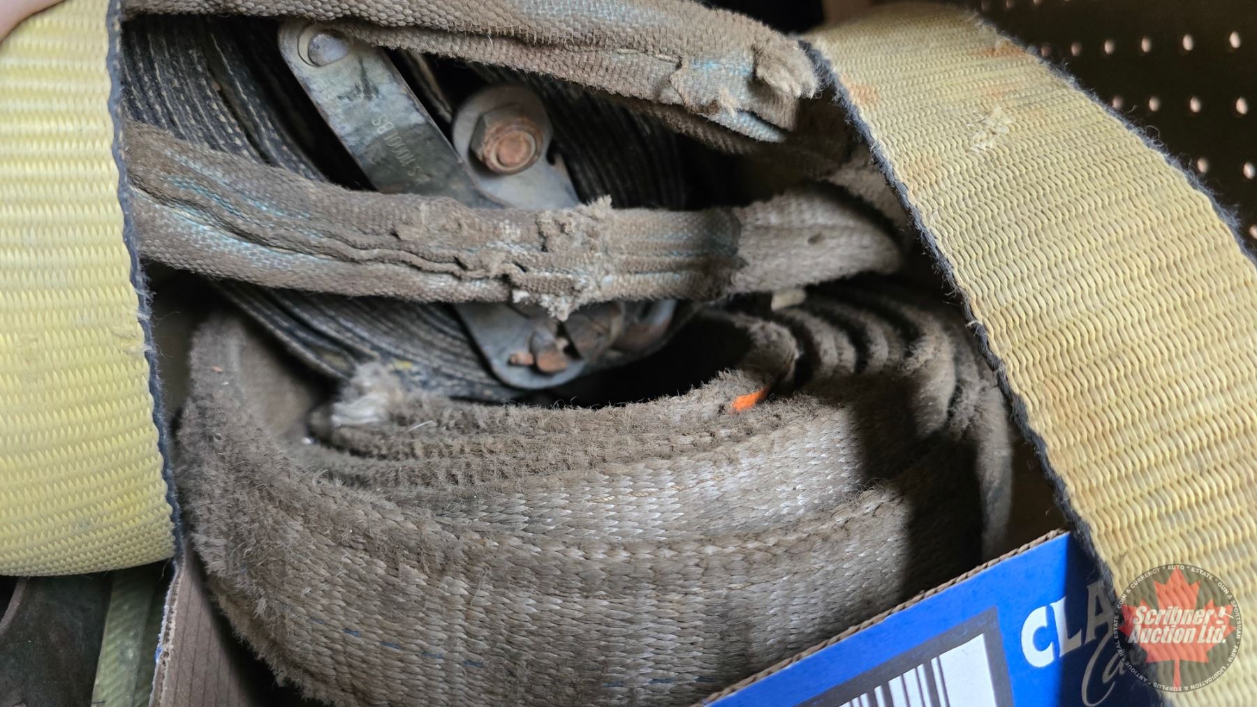 Grouping: Ratchet Straps; Yardworks Battery; Paint Troughs; Silicone Gun & Silicone; Electric Charger; Trimmer; etc