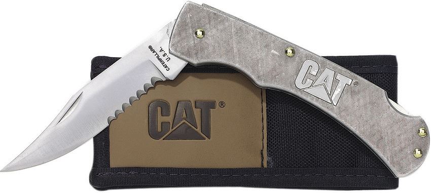 5" closed. 3.75" partially serrated stainless blade. Silver textured stainless handle. Black nylon belt sheath. Assembled in China