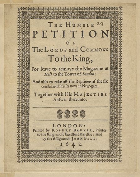 Rare imprint, The Humble Petition of the Lords and Commons to the King, for Leave to Remove the Magazine at Hull to the Tower of London: And Also to Take Off the Reprieve of the Six Condemned Priests Now in New-gate. Together with His Majesties Answer Thereunto, (London: Robert Barker), 1642. 7pp. 8vo., expertly inlaid. When religious persecution of Catholics broke out in England in 1641, Fr. Walter Colman (1600-1645) and six fellow priests were brought to trial, apparently for refusing to take an oath of allegiance to Charles I, above all others. All were condemned to be hanged, drawn, and quartered, but through the intervention of the French ambassador the execution was stayed indefinitely. Theirs became one of the most celebrated cases of religious persecution of the Reformation.