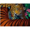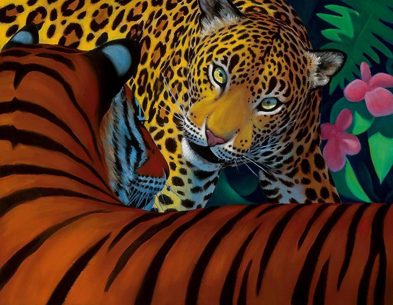 Giclee on canvas, limited edition by Charles Lynn Bragg. The two most beautiful cats, a Tiger and a Leopard, meet in a sunlit jungle. 14 X 11