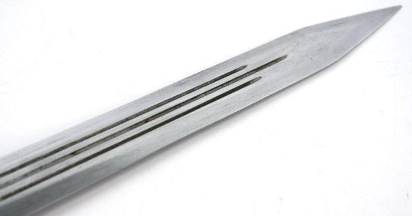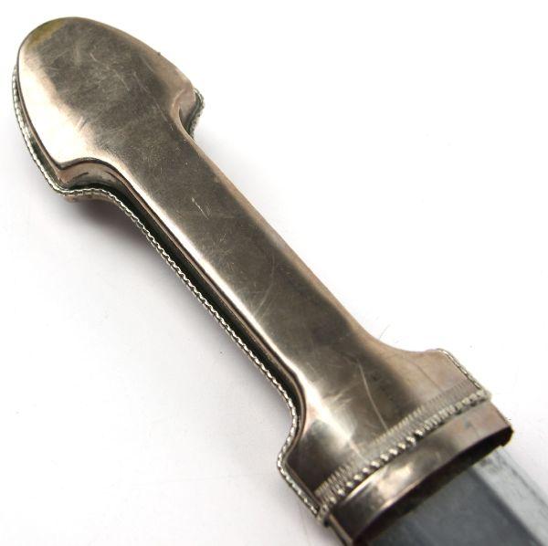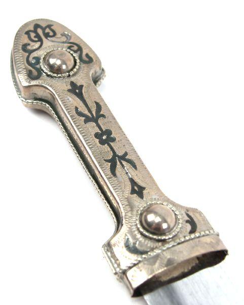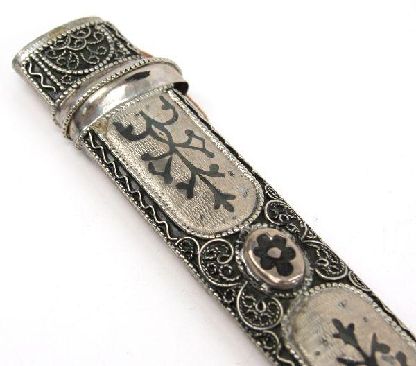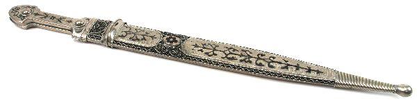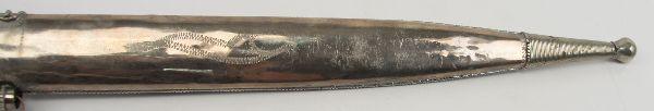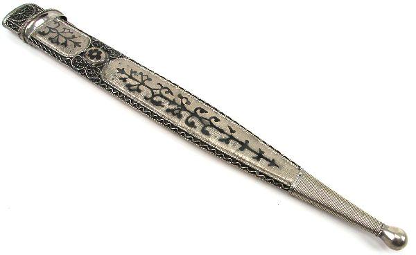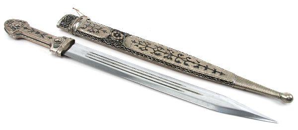 Caucasian kindjal type dagger, with 12 inch triple fuller blade. Nielloed metal scabbard, with telkari like decoration to one side. Appears to be later 0th Century production.