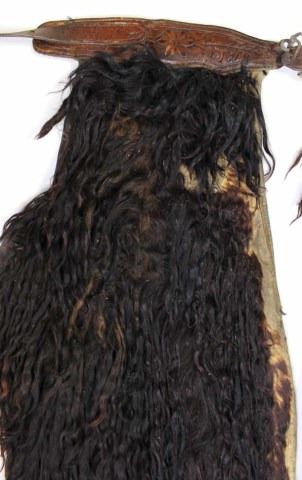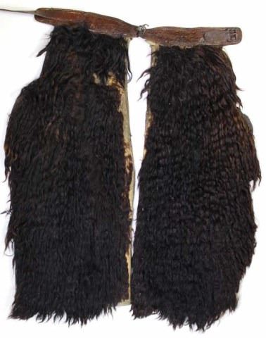 with tooled leather billet, initials JWT, buckle side of belt replace in the period, canvas lined, inside pockets, fair condition, somewhat unstable, perfect display chaps.