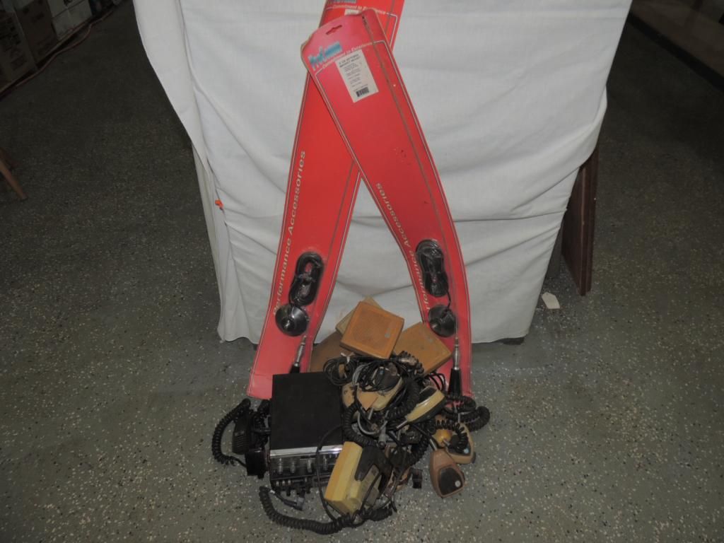 BOX LOT ASSORTED ACCESSORITES. COUPLE CB RADIOS. ANTENAS. AS SHOWN. SEE PHOTO FOR MORE DETAILS
