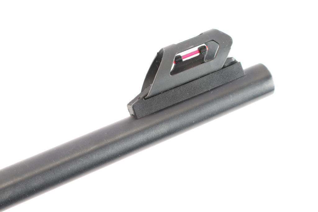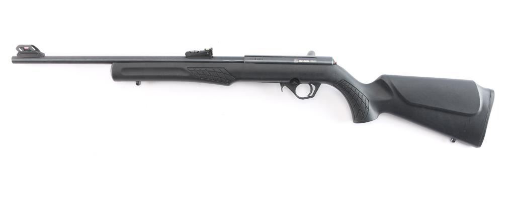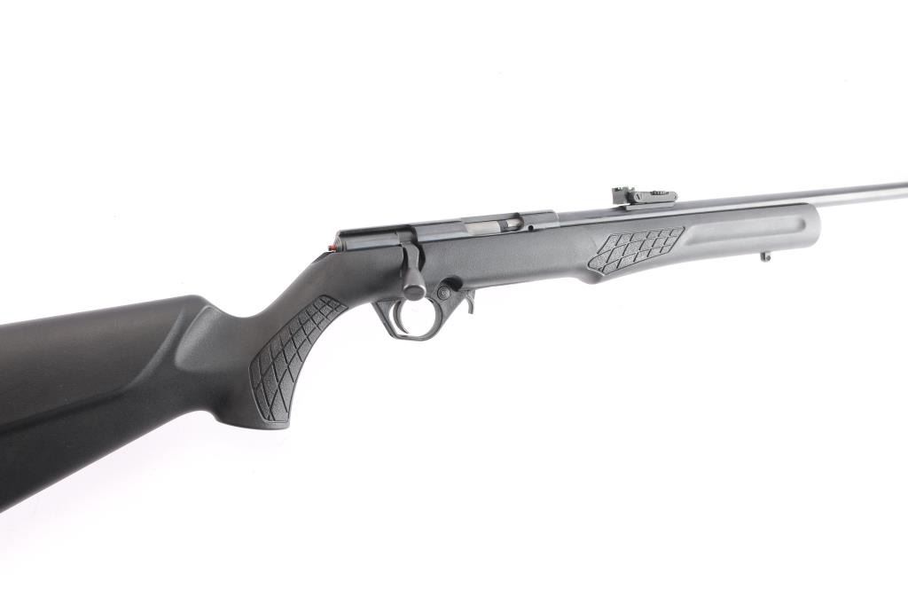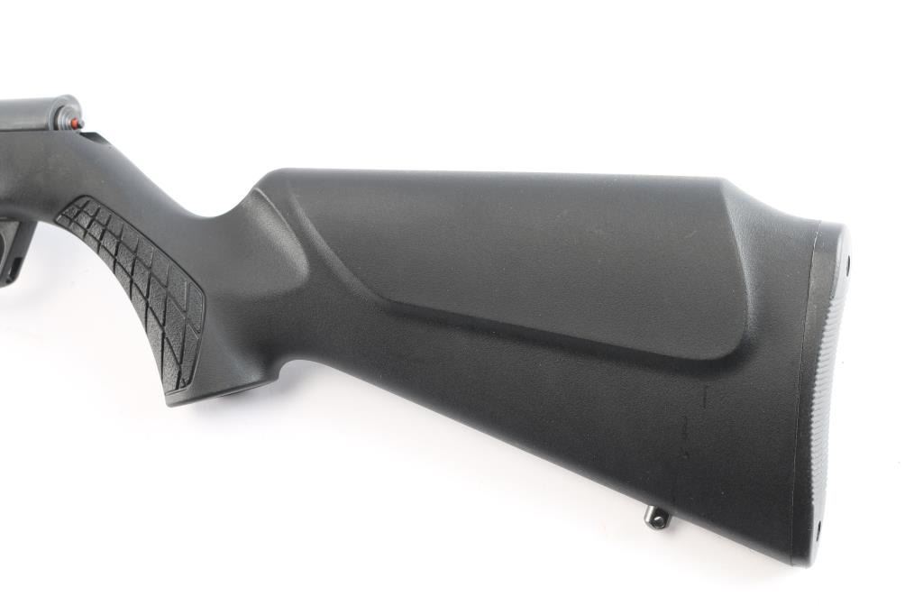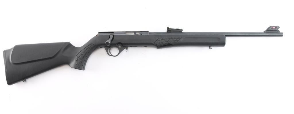 Brazilian made bolt action rimfire rifle chambered for .22 Long Rifle. Rifle features a satin blued finish, a 16" button-rifled barrel with a recessed target crown, 3/8" dovetailed receiver for optic mounting, protected raised serrated fiber optic front sight with a red insert, fully adjustable green fiber optic rear sight mounted on the barrel, detachable magazines, smooth curved trigger, turned down bolt handle, cocking indicator on the rear of the bolt, smooth lever magazine release in front of the trigger guard, and annular cut push-button manual safety. The black polymer furniture consists of a semi-pistol grip Monte Carlo style shoulder stock with square checkering at the wrist, finger-grooved forend with a square checkered grip, and sling studs in the forend and the bottom of the buttstock. Rifle retains approximately 98% of its original blued finish with superficial blemishes. Metal displays no rust, or deformation. The action is smooth and crisp, and the bore is bright with strong rifling. The polymer furniture is in excellent condition with very minor scattered handling blemishes.