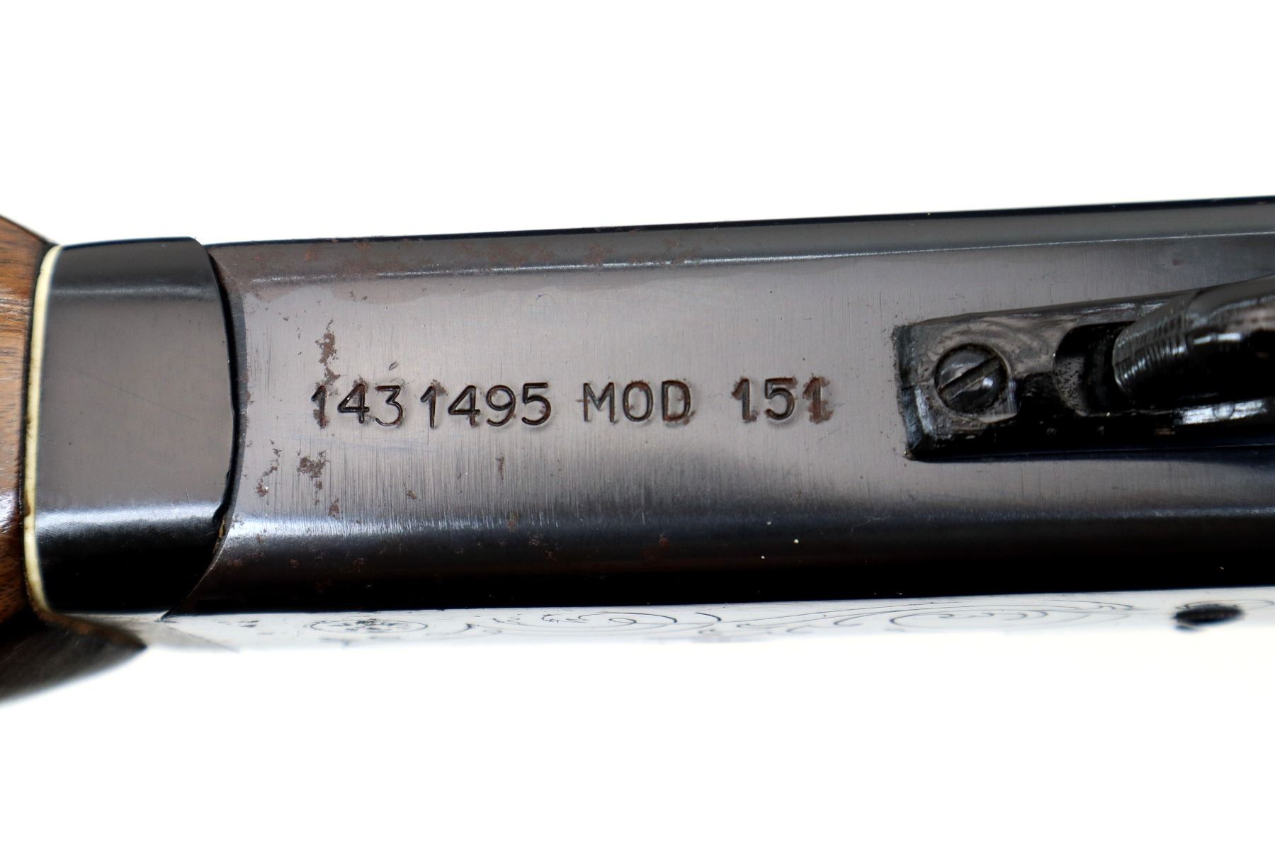 Main Description: Brass bead, blued finish, round barrel, engraved receiver, grooved spur hammer, ejector. Two piece wood stocks, pistol grip, grooved black polymer butt plate, grip cap, sling swivels.
