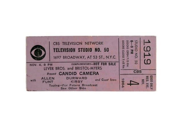 CBS Game Show Ticket "Candid Camera" Original Complementary Not For Sale Admission Ticket Nov 4th, 1964 CBS Television Studio #50 N.Y.C. Allen Fundt Host