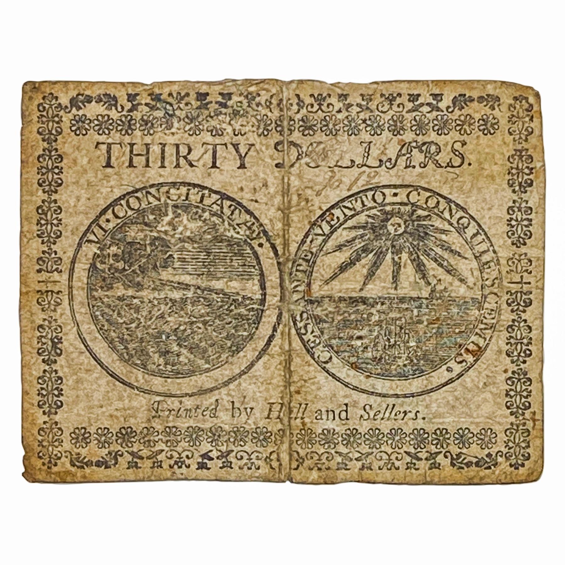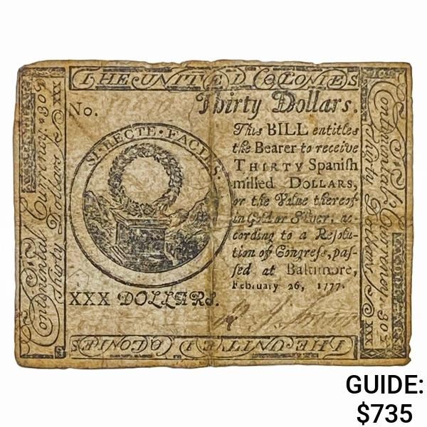CC-62 FEBRUARY 26, 1777 $30 THIRTY DOLLARS CONTINENTAL CURRENCY NOTE VERY FINE