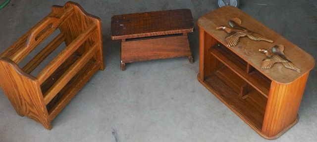 CD Shelf, Sm Step Stool, Magazine Rack, and 2 Wood Pheasants