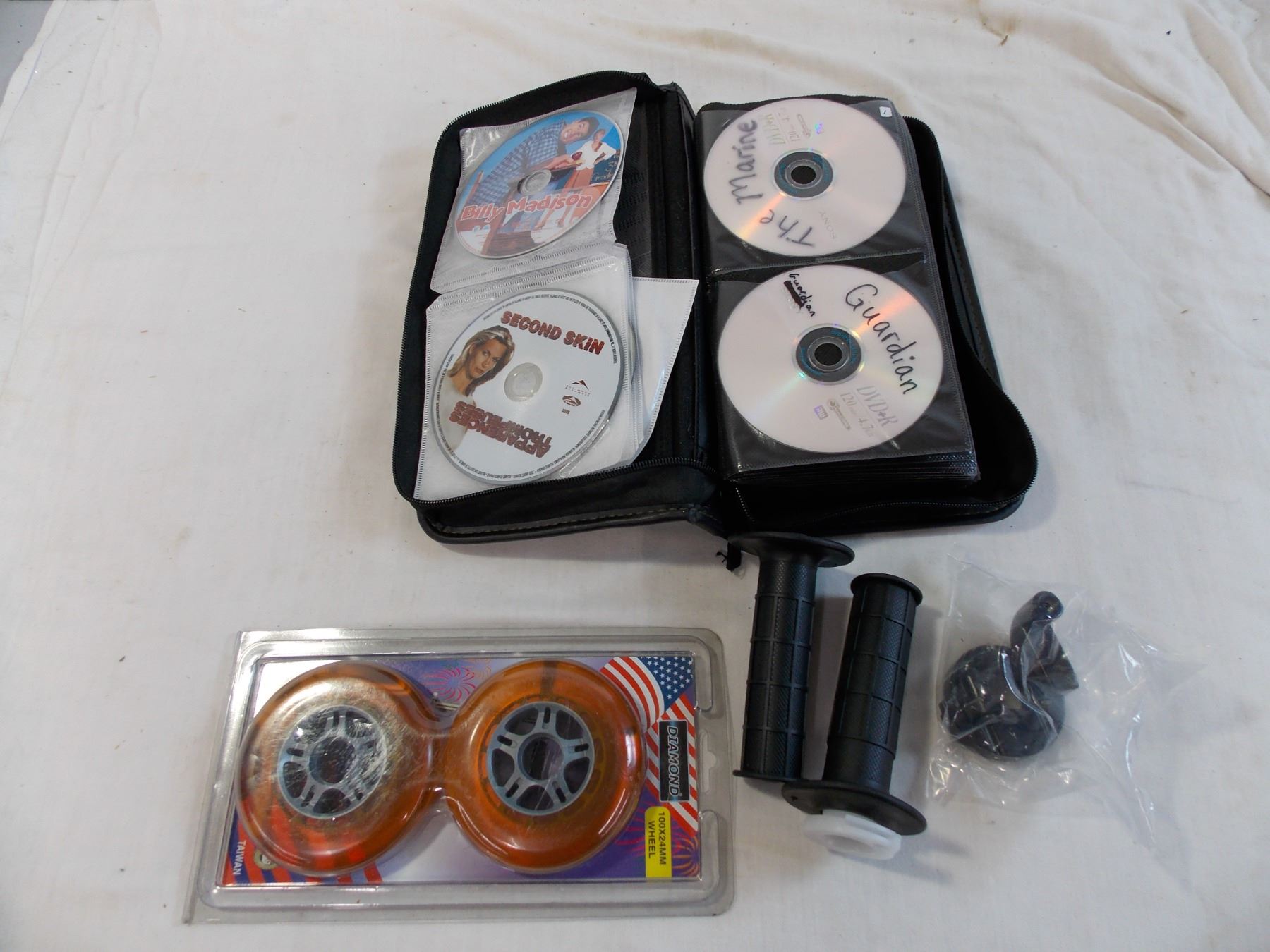 CD case with burnt DVD movies + CD's, Spare Scooter Wheels + Grip handles