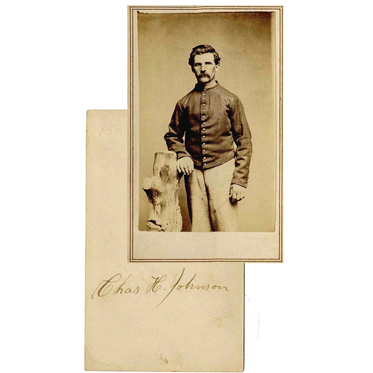 CDV of Charles H. Johnson of the 1st New Hampshire Heavy Artillery. Ink inscription to verso reads, ''Chas. H. Johnson.'' Johnson enlisted on 2 September 1864 and mustered out on 15 June 1865 at Washington, D.C. During the winter of 1864-65 the 1st New Hampshire garrisoned a line of works in the defenses of Washington and was critical to the safety of the nation's capital. Image measures 2.5'' x 4''. Top edge slightly worn. Overall, image remains bright and clear. Excellent condition.