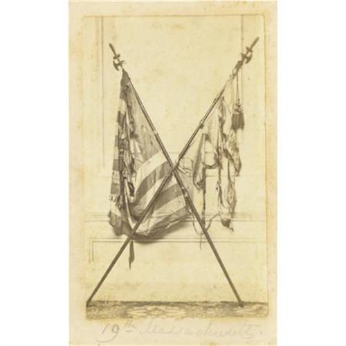 <B>CDV PHOTO OF DAMAGED 19TH MASSACHUSETTS UNIT FLAG & US FLAG CA 1860S.</B></I> Early <I>carte de visite </B></I>of the 19th Massachusetts (Infantry) unit flag and United States flag recovered from battlefield. Published by J. E. Tilton & Co. of Boston, a manufacturer and importer of photographic albums & CDVs. Identified on obverse of image "<I>19th Massachusetts.</B></I>”<I> </B></I> <BR><BR><B>Condition:</B></I> Fine, light foxing.<BR><BR><b>Shipping:</b> Flat Material, Small (<a target="_blank" href="http://www.heritageauctions.com/common/shipping.php">view shipping information</a>)