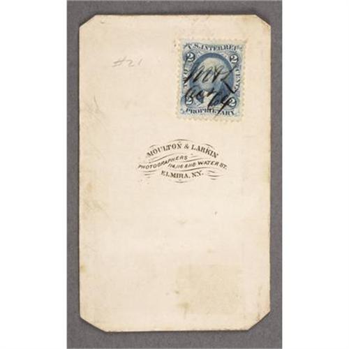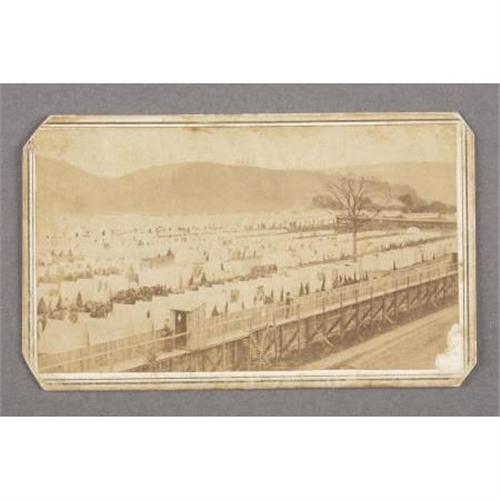 <B>CDV ELMIRA CONFEDERATE PRISON CAMP CA 1860S.</B></I> Elmira Prison was a prisoner-of-war camp constructed by the Union Army during the American Civil War to house captive Confederate soldiers. Located in Elmira, New York, the prison was one of the largest facilities in the North. The site was selected partially due to its proximity to the Erie and New York Railroads, which criss-crossed in the midst of the city, making it a prime location for an Army training and musters point early in the Civil War. A great deal of the 30-acre Union installation, known as Camp Rathbun, fell into disuse as the war progressed to Canada, and the camp's "Barracks #3" were converted into a Civil War prison camp in the summer of 1864. The camp, in use from June 6, 1864, until the fall of 1865, was dubbed “Hellmira” by its inmates. This is a period <I>carte de visite, </B></I>2.5” x 4”, photographed by Moulton & Larkin, Elmira, N.Y. of this very hellish P.O.W. Camp. <BR><BR><B>Condition:</B></I> Very good, foxing, all four corners have been clipped and small corner of albumen paper missing lower right bottom corner.<BR><BR><b>Shipping:</b> Flat Material, Small (<a target="_blank" href="http://www.heritageauctions.com/common/shipping.php">view shipping information</a>)