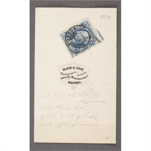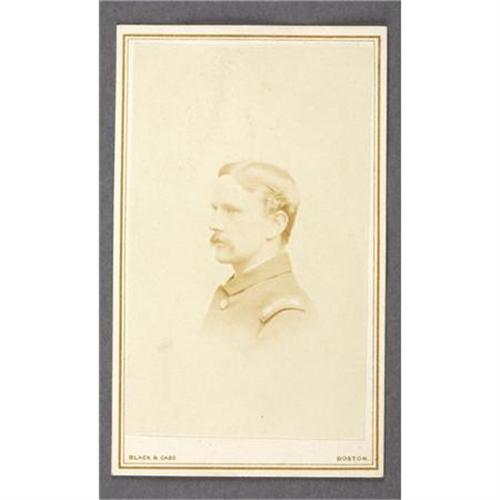 <B>CDV LT. COL. WALDO MERRIAM, KILLED AT SPOTSYLVANIA 1864.</B></I> Merriam, an officer in the 16th Massachusetts Infantry was wounded in action at Gettysburg and killed on May 12, 1864 at the Battle of Spotsylvania, Virginia. This <I>carte de visite,</B></I> 2.5” x 4”, of this famous Civil War officer was taken in the photographic studio of Black & Case Boston, Massachusetts. <BR><BR><B>Condition:</B></I> Very good, a little light on contrast.<BR><BR><b>Shipping:</b> Flat Material, Small (<a target="_blank" href="http://www.heritageauctions.com/common/shipping.php">view shipping information</a>)
