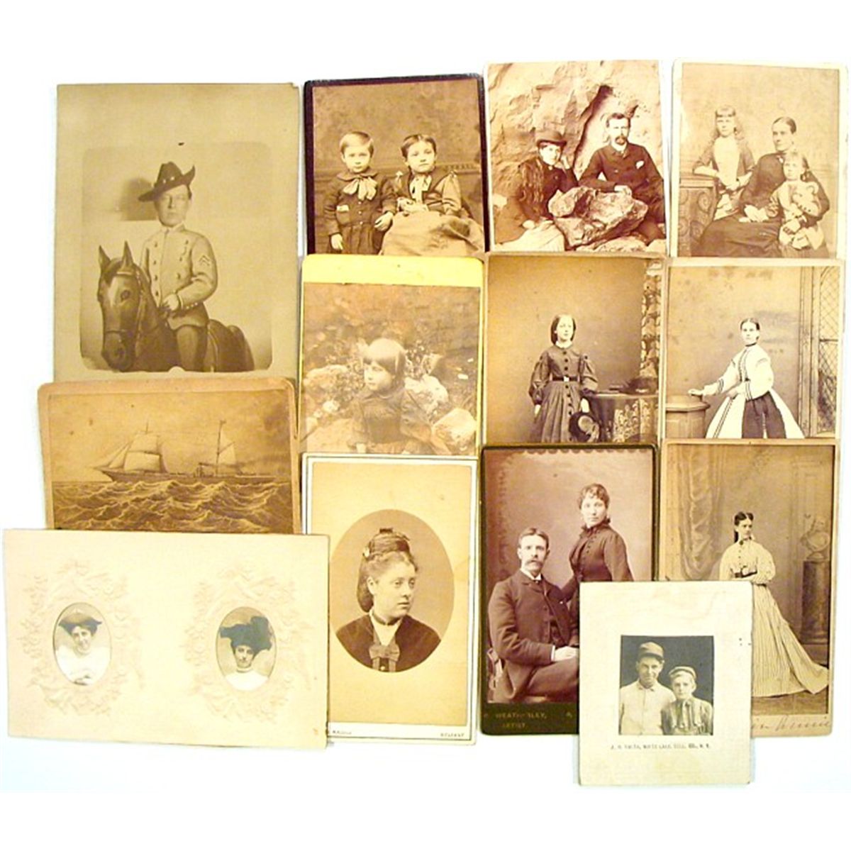 Albumen CDV collection mainly from London, Belfast and Glasgow. Thirteen CDVs in total. Some signed and dated on verso. Those dated are from 1867-1869. A great variety of nineteenth century images showing couples, families, and steamships. Excellent condition.