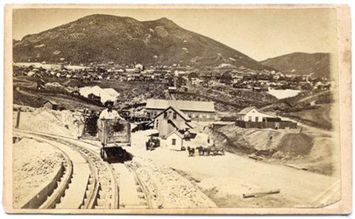 From the Lower Dump of the Gould & Curry Mine, Virginia City." CDV by Lawrence & Houseworth, from their "NEVADA" series, with a strip label on the verso, number 718. Trace of revenue stamp that has been removed. A workman behind an ore car in the foreground. [3+]