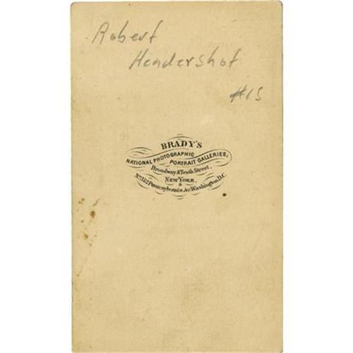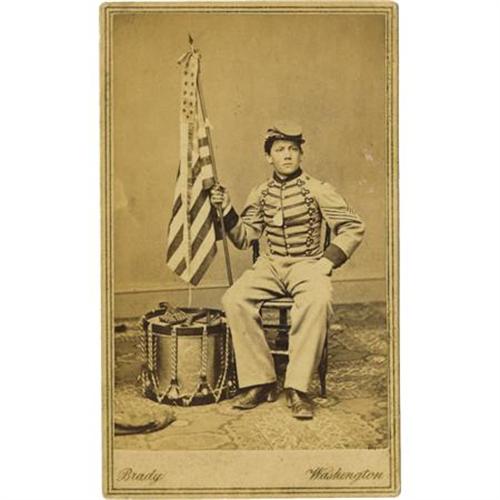 <B>CDV PHOTOGRAPH DRUMMER BOY ROBERT HENDERSHOT CA 1860S.</B></I> War fever had gripped Jackson after the fall of Fort Sumter and like many others, Hendershot longed for the glory of battle. His widowed mother may also have hoped that military life might instill some discipline in her delinquent son. He was a frequent runaway, and his aversion to school was such that he could not even sign his own name. He claimed to be ten that summer of 1861, but like many aspects of his life, that is in dispute, as various documents give birthdates ranging from early 1846 to 1851, and no less than four different birthplaces, from Michigan to New York City. When he enlisted, Hendershot was a slight-framed boy, 4½ feet tall, with fair hair, hazel eyes and a ruddy complexion. He bore a deep scar under his right eye that he would submit as his first badge of courage. He soon dropped his implausible claim to have received that scar as the result of a severe wound at Shiloh (at the time his regiment had been camped more than 600 miles away). By the end of 1862, though, events at Fredericksburg would give him another, more believable, opportunity for fame. In the fall of 1861, Hendershot was a fixture in the camp of the Jackson County Rifles. There, he incessantly practiced his drum calls, an activity that caused at least one recruit to call him "a perfect little pest." He apparently accompanied the Rifles to Fort Wayne, outside Detroit, where the unit became Company "C" of the 9th Michigan Infantry. Robert claimed to have enlisted along with the others, but said that the mustering officer rejected him because of extreme youth. In any case, he boarded the train that carried the regiment south, either as a stowaway or as a servant to Captain Charles V. DeLand, the commander of Company "C" and editor of Jackson's <I>American Citizen</B></I>. Robert formally enlisted in the 9th in March 1862, when the regiment moved from Kentucky to Murfreesboro, Tenn. He remained with Company "C", which was posted at the Murfreesboro courthouse as provost guards. He was there on July 13 when Confederate Colonel Nathan Bedford Forrest launched a pre-dawn raid on the town. During the battle, Robert claimed that he fearlessly exposed himself to enemy fire, a claim later substantiated by several 9th Michigan soldiers. This exquisite albumen CDV of the Hendershot “Drummer Boy” was photographed by Brady of New York and Washington D. C. <BR><BR><B>Condition:</B></I> Very fine, fantastic contrast.<BR><BR><b>Shipping:</b> Flat Material, Small (<a target="_blank" href="http://www.heritageauctions.com/common/shipping.php">view shipping information</a>)