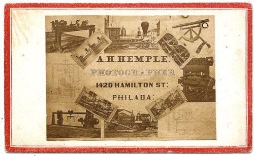 For A. H. Hemple, Philadelphia. A collage of images and stereo views of railroad and engineering subjects. Red-bordered CDV is slightly light. [2+]