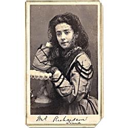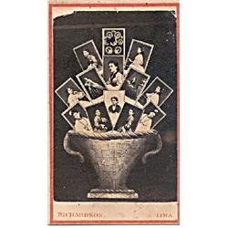 A basketfull of CDV's of Peruvian beauties-- a composite by V. L. Richardson, Lima. (One of the images is itself a composite.) Plus one of a beautiful woman identified in pen on the bottom margin as "Mrs. Richardson." Richardson was an American photographer brought to Peru by B. F. Pease. No wonder he stayed there. First has a chunk of the upper left corner missing, as made. Second has mount corners neatly clipped.